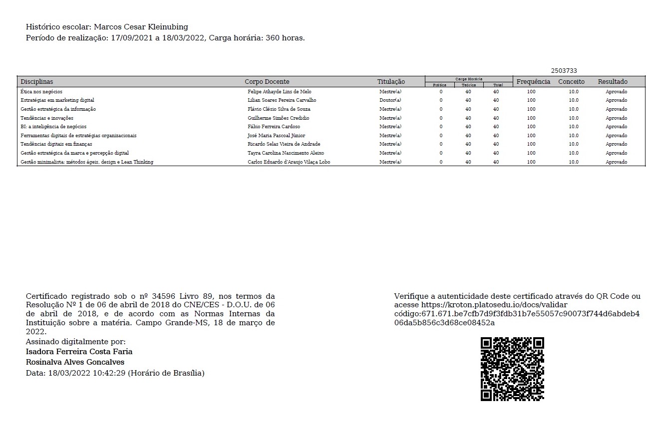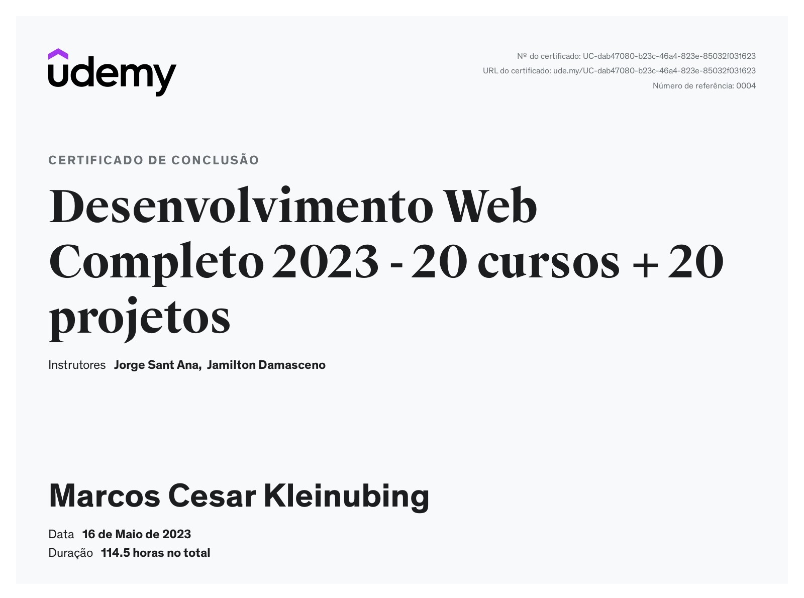Html, CSS, conceitos em javascript foram estudados em mais de 120 horas.