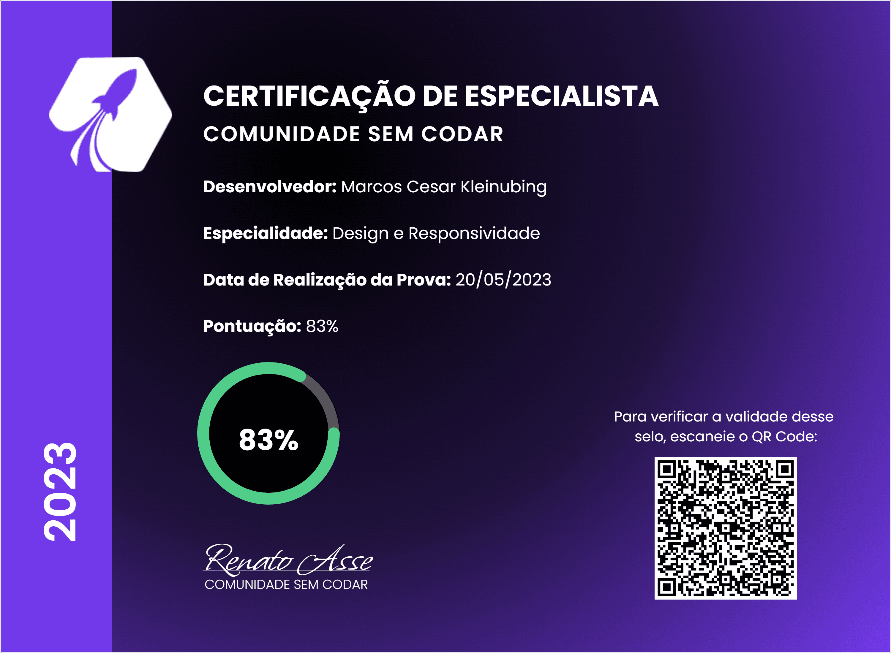 Aluno e membro da Comunidade Sem Codar com várias certificações concluídas. Acima está a certificação em design e responsividade.